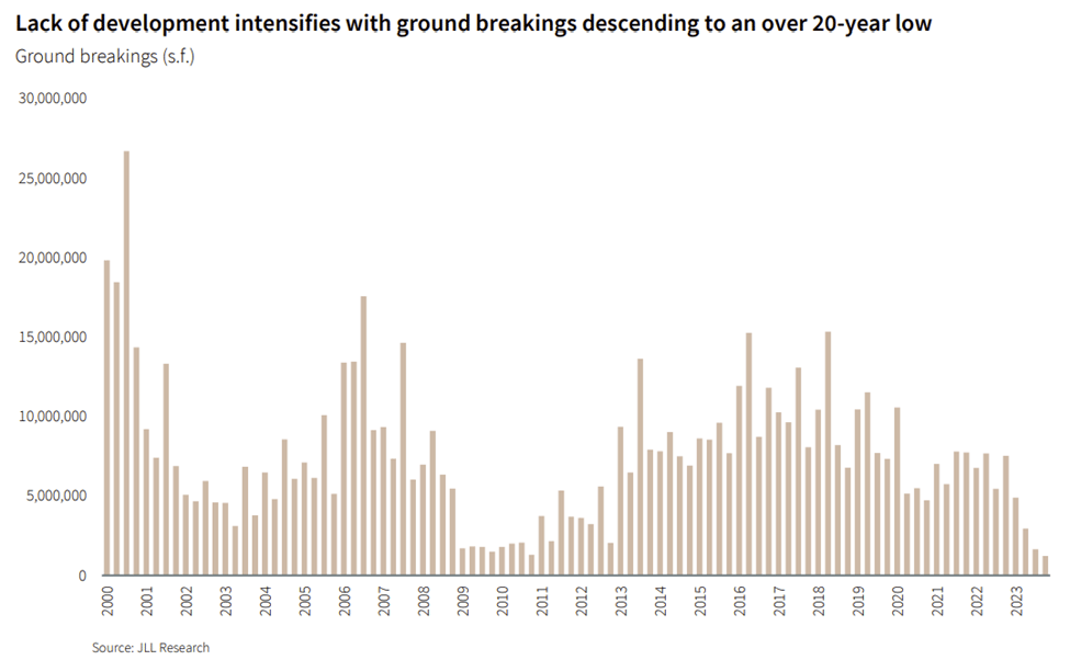 JLL notes the rapid decrease in upcoming office supply in their Q4 2023 US Office Outlook in the chart below. JLL projects that beyond the current data, office deliveries are expected to decline to roughly 35 million s.f. in 2024, 15 to 20 million s.f. in 2025, and potentially under 10 million s.f. in 2026. This lack of supply at the very top of the market is likely to drive spillover demand into the Class A market more broadly, as trophy rents grow and availability is slim. JLL notes that in Q4 2023, the signs of this spillover effect are becoming more evident, as Class A offices generally across all CBD submarkets essentially saw stable occupancy for over 1.1 billion s.f. of inventory.